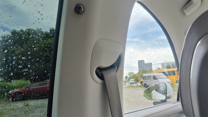 一个有趣的细节:后排的出风口是位于B柱上的,当前排座椅进入小憩模式时,靠背大角度放倒,靠背会直接越过后排空间,此时后排的出风口会直接吹到休息的前排乘客头部。短暂休息一下还好,睡觉时间长了要小心头风哦~