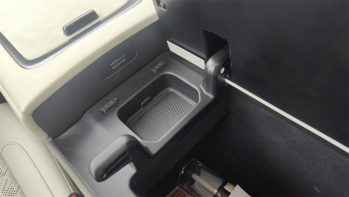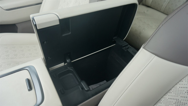 至于为什么会把出风口安置在B柱上呢?除了出风更均匀之外,还有一个很重要的原因:副中控台被别的设计占据了空间。Console的后方除了带有一个隐藏的储物格之外,下方还有一个把手;同时打开扶手箱之后,扶手箱前方隐藏了一个按键,按下的同时拉起把手可以把Console的整个后半部分拆除。这部分其实是给用户自行更换选装的车载冰箱准备的。
