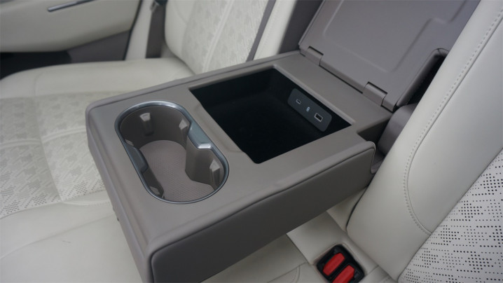 后排的表现自然是不能拉胯的。有了充裕的空间发挥,7X的后排座椅非常宽大厚实,虽然面料的手感不算很细腻,但是坐起来能够很好地兼顾舒适性与支撑性,坐垫的长度很充足,加上靠背有比较大的角度调节范围,要找到自己适合的坐姿并不难。中部还有一个很宽大的扶手,内部隐藏了储物格和USB口,后排乘客充电不用再猫下腰了。