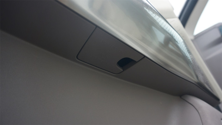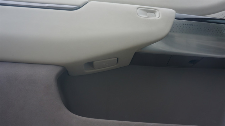 车窗开关使用的拨杆样式很精致,但是容易让人混淆车窗升降方向。车门开关使用了按键的样式,并且带有比较深的内凹,防止大腿误触。同时,主驾侧车门的扶手底部还隐藏了一个盖子,这个盖子实际上是一条牵连着绳索的拉手,一旦拉下车窗玻璃会自动破裂。这种“一键破窗”的功能我还是第一次见。