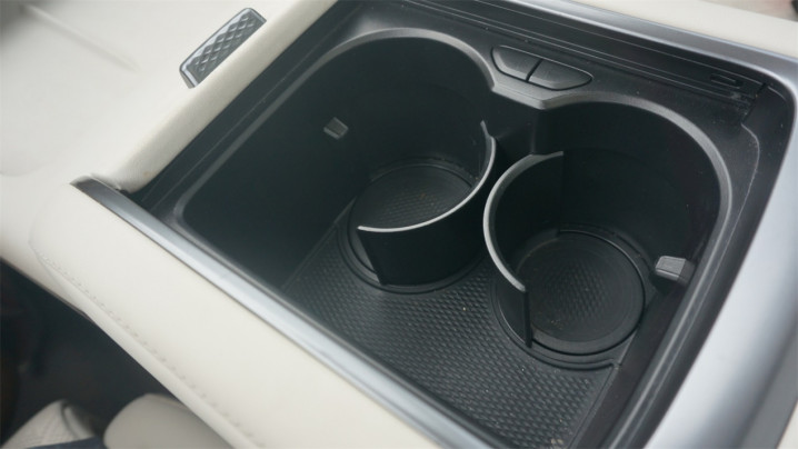 譬如杯架,上层有一个柔性的盖板,可以拉出来遮盖杯架,也可以收起,表面包裹了仿皮材质,不过拉起的手感会有点费劲。内部的杯架甚至还带有可变围挡的设计,能够把围挡收起变成储物格,也可以通过外侧的按钮将围挡重新释放出来变回杯架,底部还有防滑设计。