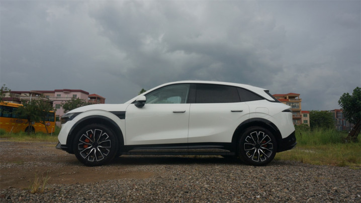 从侧面来看,车头比较短,车身长度都尽可能留给了乘员舱,显然整体比例的美观性还是向实用性的方向妥协了。不过细节上下了很多功夫,譬如前机盖是很圆润的蚌式,侧窗使用了隐藏式的水切,C柱使用了分割式的造型,还有隐藏在扰流器内的后雨刮等等。而且这台车使用了选装的20英寸轮圈,张力很足,还有亮色的刹车卡钳“抢戏”。