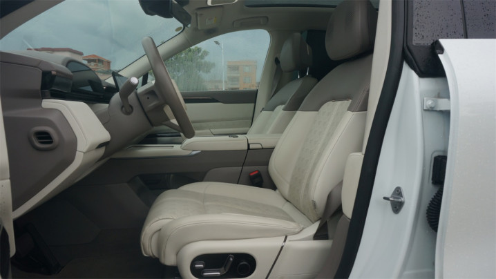 座椅填充很厚,带有加热、通风,包裹感良好,但是没有腿托,而且拼色的浅色部分不是很耐脏,时间久了浅色部分的皮革容易泛黄,另外安全带高度也不可调节。